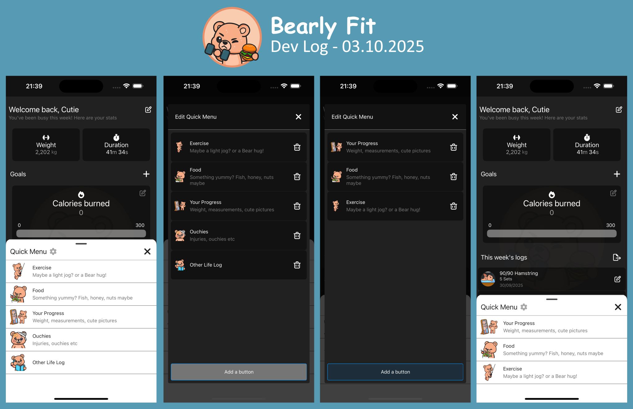 3rd Oct, 2025Today on Bearly Fit (well technically last night) I have mostly been improving the quick menu!